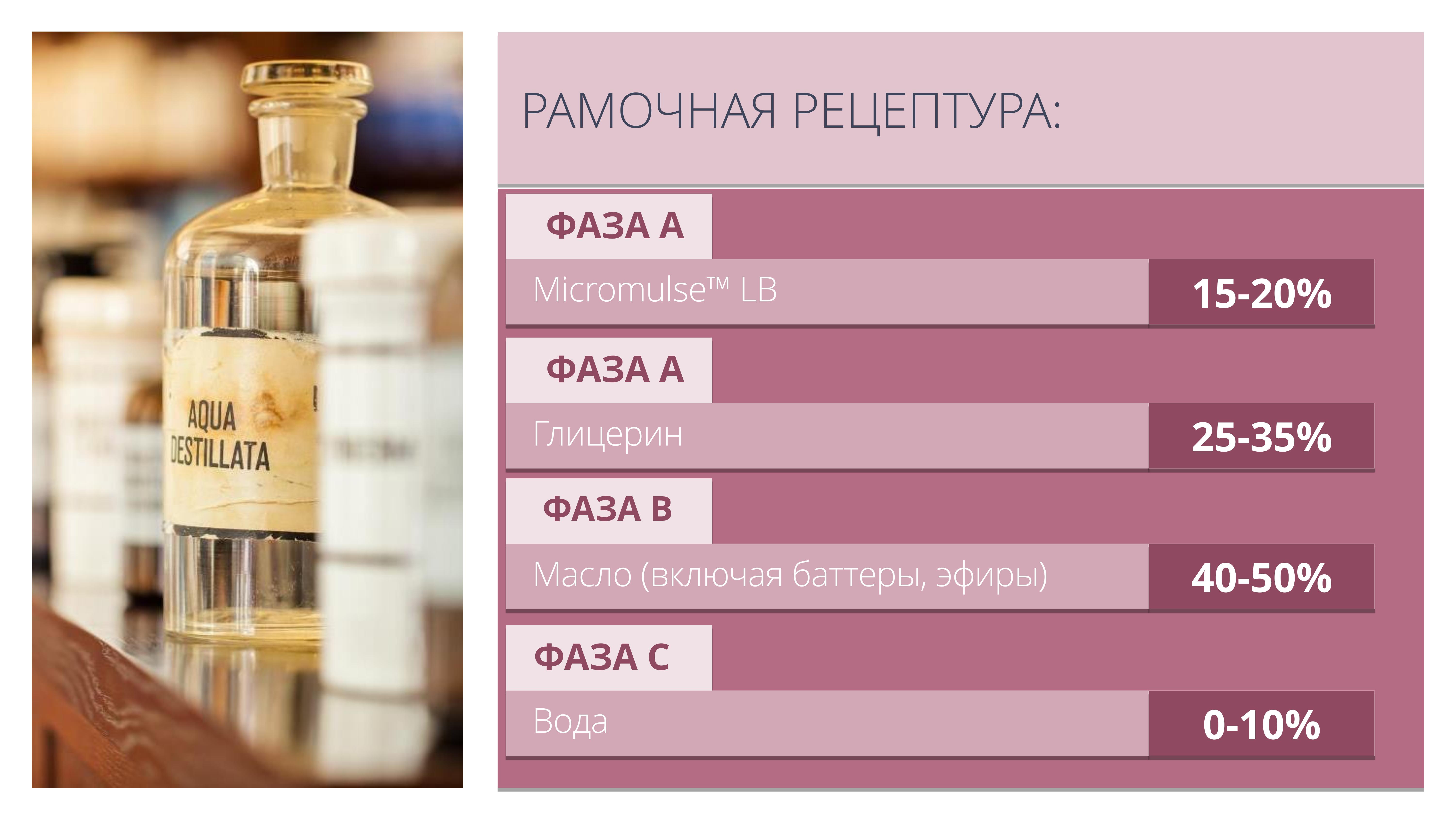 Позволяет создавать ультра актуальные прозрачные мицеллярные масла для очищения кожи и снятия макияжа, продукты для купания («молочные ванны»), гидрофильные масла для душа.